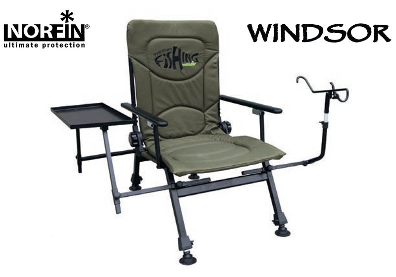 Η συγκεκριμένη καρέκλα της Norfin έχει ονομασία "WINDSOR", είναι κατασκευασμένη από αλουμίνιο, με αποτέλεσμα να είναι αρκετά ελαφριά σε σχέση πάντα με το μέγεθος της. Μπορεί να συναρμολογηθεί εύκολα στον χώρο που έχουμε επιλέξει να ψαρέψουμε. Διαθέτει δεξιά κι αριστερά στηρίγματα για τα χέρια μας. Επίσης είναι εφοδιασμένη με δύο έξτρα προσθήκες που αν θελήσουμε μπορούμε να τοποθετήσουμε δεξιά κι αριστερά της καρέκλας. Η μία είναι ένα τετράγωνο αλουμίνιο που έχει ως σκοπό την διευκόλυνση μας στο να διολώσουμε τις αρματωσιές μας έχοντας εκεί πάνω απλωμένα τα δολώματα μας και οτιδήποτε άλλο χρειαζόμαστε άμεσα στο ψάρεμα μας. Η δεύτερη είναι μία προσθήκη που λειτουργεί ως βάση του καλαμιού μας. Τέλος διαθέτει ρυθμιζόμενη πλάτη.