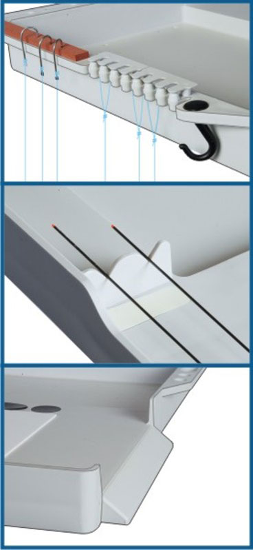 • Η βάση διαθέτει θήκες για κουτάκια δολωμάτων, φελλό για αγκίστρια, υποδοχές για παράμμαλα, σκληρό μέρος για κόψιμο δολωμάτων,μαγνητάκια για αγκίστρια ή μεταλικά rigs, καθώς και μέρη για το ψαλιδάκι την βελόνα ή τον απαγκιστρωτή!