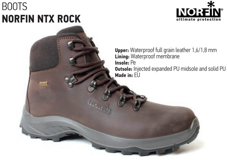 Διαπνέον μποτάκια εξαιρετικής ποιότητα από την NORFIN που ακούνε στο όνομα NTX ROCK. Ιδανική επιλογή για ψάρεμα σε βράχια ενώ ενδείκνυται και για ορειβασία. Διαθέτουν ποιοτικούς μαλακούς και πάνω από όλα ορθοπεδικούς πάτους ώστε να νιώθουμε άνετα. Είναι διαπνέον που σημαίνει πως αναζωογονείται ο αέρας με αποτέλεσμα να μην ιδρώνουν τα πόδια μας. Είναι κατασκευασμένα από 100% δέρμα του οποίου η προσαρμογή του στη σόλα έχει γίνει με τέτοιο τρόπο ώστε να μην έχουν χρησιμοποιηθεί πολλές ραφές. Όσο λιγότερες ραφές σε τέτοιου τύπου μποτάκια τόσο το καλύτερο, ειδικά ως προς την αδιαβροχοποίηση τους αλλά και την αντοχή τους στο χρόνο. Τα μποτάκια NTX ROCK επομένως είναι ανθεκτικά και πλήρως αδιάβροχα για... πολλά χρόνια σκληρής χρήσης!!! Δένουν αρκετά ψηλά ώστε να κρατάνε τον αστράγαλο καλά ασφαλισμένο σε κάποιο πιθανό στραβοπάτημά μας την στιγμή που περπατάμε σε βράχια. Τέλος διαθέτουν τραχτερωτή σόλα για ασφαλή "πατήματα" σε δύσκολα εδάφη...