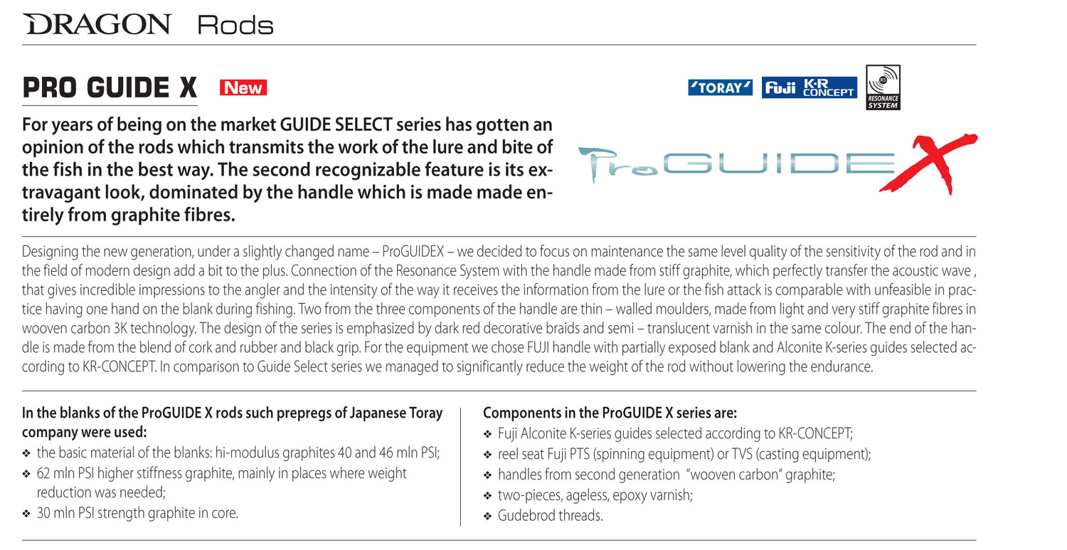 Σχεδιάζοντας τη νέα γενιά, με όνομα - Pro GUIDE X - αποφασίσαμε να επικεντρωθούμε στη διατήρηση της ίδιας ποιότητας, ευαισθησίας, φινέτσας, προσθέτοντας μόνο τον ποιο μοντέρνο σχεδιασμό, το μικρότερο βάρος χωρίς να χάσουμε σε δύναμη! Το νέο υλικό που χρησιμοποιήθηκε ακούει στο όνομα 3Κ γραφίτης της Ιαπωνικής 'Toray'