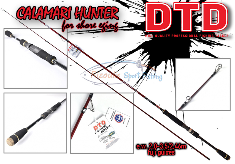 Ποιος θα ήταν ο ποιο κατάλληλος Ευρωπαίος κατασκευαστής για καλάμι Eging, με τον τρόπο που ασκείται η τεχνική στη Μεσόγειο, αν όχι η Κροατική εταιρία DTD; Το καλάμι Calamari Hunter διαθέτει όλες τις απαραίτητες προδιαγραφές για να ικανοποιήσει τους φίλους του παράκτιου ψαρέματος καλαμαριών. Η DTD σχεδίασε, δοκίμασε και κατασκεύασε ένα προσιτό καλάμι με υψηλών προδιαγραφών περιφερειακό εξοπλισμό.