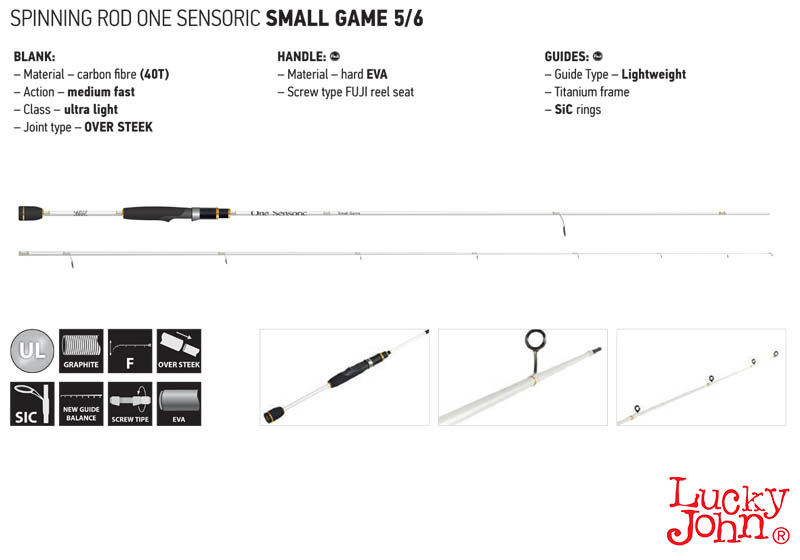 Πιο συγκεκριμένα είναι κατασκευασμένο από κορυφαία υλικά. Το υλικό κατασκευής του είναι carbon fiber (40T) εξαιρετικής ποιότητας, ικανό να μεταδόσει πολλές πληροφορίες στο χέρι μας κατά την διάρκεια του ψαρέματος. Τα περιφερειακά του ONE SENSORIC SMALL GAME 762ULMF εντυπωσιάζουν. Η Lucky John έχει επιλέξει να τοποθετήσει τους νέους οδηγούς της εταιρείας FUJI, που είναι μονής στήριξης τύπου "Ο". Είναι κατασκευασμένοι από ΤΙΤΑΝΙΟ και το εσωτερικό τους είναι από SIC υλικό ενώ ανήκουν στην σειρά AT της εταιρείας FUJI. Η βάση του μηχανισμού είναι επίσης της εταιρείας FUJI δίνοντας μας την σιγουριά για το πολύ δυνατό κράτημα του μηχανισμού μας στο καλάμι. Είναι τοποθετημένο σε αυτήν ποιοτικό υλικό EVA ώστε να μην γλιστράει από τα χέρια μας το καλάμι κατά την διάρκεια του ψαρέματος. Βιδώνει από πάνω προς τα κάτω με αποτέλεσμα να μη ξεβιδώνει εύκολα κατά την διάρκεια των πολλαπλών Jerks-Twitches που απαιτεί η τεχνική.