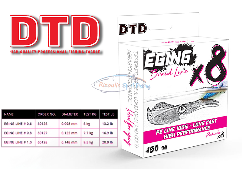 Η DTD παράγει το νήμα Eging σε μπομπίνα των 150 μ, σε μονόχρωμη έκδοση, σε Ροζ χρώμα για να έχετε εύκολη οπτική από την ακτή.