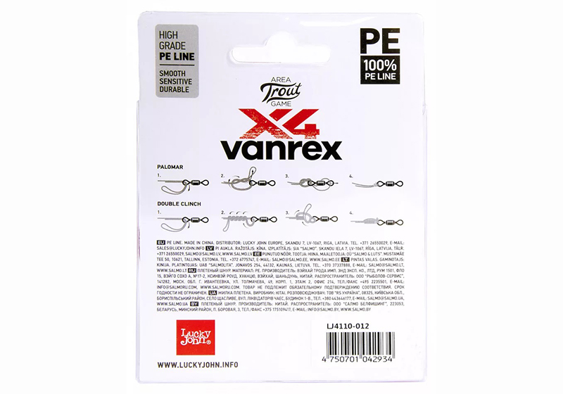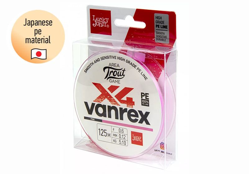 Όπως γνωρίζουμε η Lucky John είναι μία ολοκληρωμένη εταιρεία, έτσι από την συλλογή της δεν θα υπήρχε περίπτωση να λείπουν τα νήματα. Η πλέον εξειδικευμένη και ποιοτική πρόταση της εταιρείας για LRF & EGI είναι το 4-κλωνο νήμα με ονομασία VANREX X4 AREA TROUT. Η όσο το δυνατόν στρογγυλή του διατομή σε συνδυασμό με την ολισθηρή επιφάνεια του νήματος, λόγω της διακριτικής του επικάλλυψης από κερί, έχουν ως αποτέλεσμα να πετυχαίνουμε πολύ μακρινές ρίψεις των τεχνητών δολωμάτων μας χρησιμοποιώντας το. Η πλέξη του αποτελείται από τέσσερις κλώνους Ιαπωνικού πολυαιθυλενίου ( JAPANESE PE MATERIAL ). Θα το βρείτε σε συσκευασία των 125 μέτρων. Οι διαστάσεις που είναι διαθέσιμο είναι ιδαίτερα λεπτές κάτι που το καθιστά ιδανικό για Ultra Light Rock Fishing. Το χρώμα του είναι ροζ. Τα ιδιαίτερα χαρακτηριστικά του είναι: