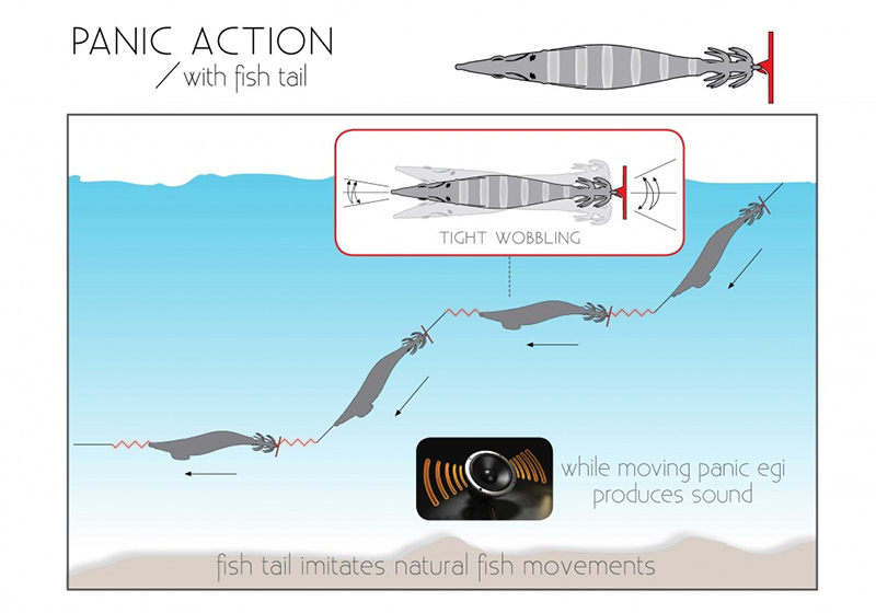 Η καλαμαριέρα DTD Panic Egi είναι υβριδικό μοντέλο, κάτι μεταξύ της στάνταρ καλαμαριέρας Eging από ακτή και της καλαμαριέρας συρτής. Η πιο σημαντική καινοτομία είναι η πλαστική ουρά που κουμπώνει εύκολα, πίσω από τα αγκίστρια και η οποία προσδίδει στην καλαμαριέρα μια απόλυτα φυσική κίνηση ψαριού, με λίγο τρέμουλο. Η κίνηση “wobbling” που προκαλεί η ουρά, είναι φυσική και διατηρείται ανεξάρτητα από την ταχύτητα ανάκτησης. Αυτό το τρέμουλο κάνει την συγκεκριμένη καλαμαριέρα δέλεαρ προς τα κεφαλόποδα, καθώς παρομοιάζει ψάρι τραυματισμένο, ή σε πανικό.