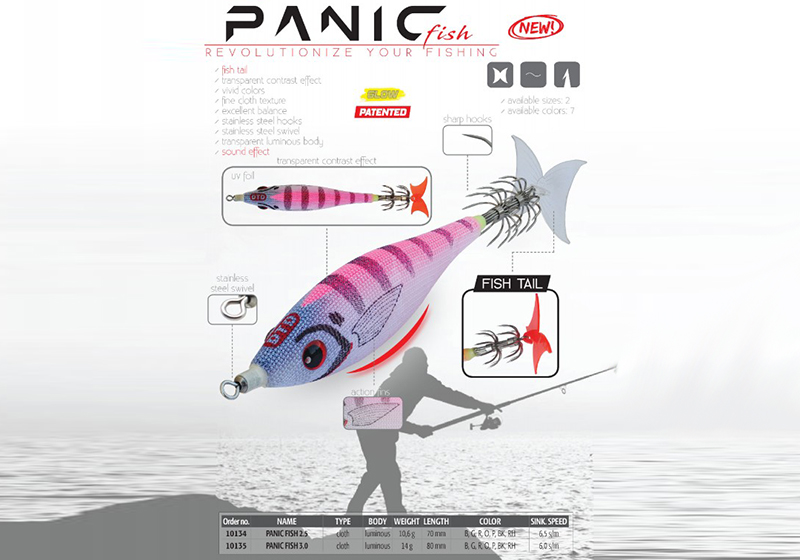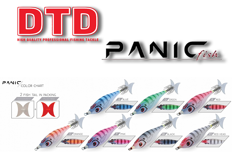 Η καλαμαριέρα DTD Panic Fish είναι υβριδικό μοντέλο, κάτι μεταξύ της στάνταρ καλαμαριέρας από βάρκα και της καλαμαριέρας συρτής. Η πιο σημαντική καινοτομία είναι η πλαστική ουρά που κουμπώνει εύκολα, πίσω από τα αγκίστρια και η οποία προσδίδει στην καλαμαριέρα μια απόλυτα φυσική κίνηση ψαριού, με λίγο τρέμουλο. Η κίνηση “wobbling” που προκαλεί η ουρά, είναι φυσική και διατηρείται ανεξάρτητα από την ταχύτητα ανάκτησης. Αυτό το τρέμουλο κάνει την συγκεκριμένη καλαμαριέρα δέλεαρ προς τα κεφαλόποδα, καθώς παρομοιάζει ψάρι τραυματισμένο, ή σε πανικό.