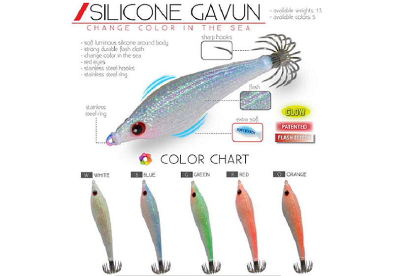 Τα μάτια της Silicone Gavun είναι έντονα κόκκινα, τα ανοξείδωτα αγκύλια έχουν μεγάλο άνοιγμα χαρακτηριστικό που την κάνει ιδανική για το ψάρεμα σουπιάς. Είναι κατάλληλη και για την τεχνική IKA Metal.