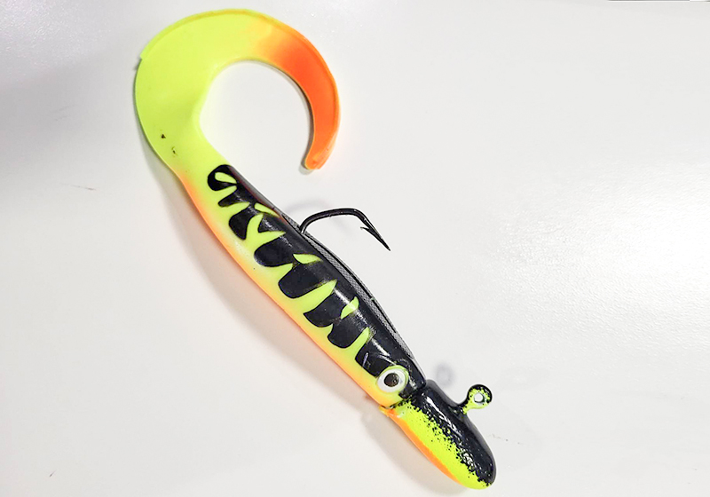 Το αγκίστρι της είναι VMC 5150BN 10/0 και στα 60γρ 6/0, εξαιρετικά αιχμηρό και δυνατό κατάλληλο για μεγάλα θηράματα!! Επίσης διαθέτει δεύτερο κρίκο για την τοποθέτηση "κλέφτη" αν επιθυμούμε και ειδικό άγκιστρο συγκράτησης της σιλικόνης.
