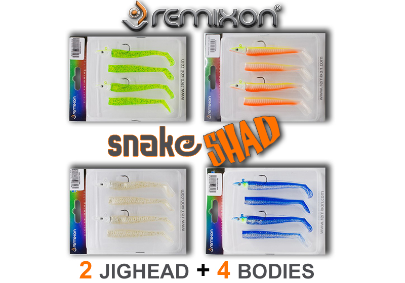 Η Remixon δημιούργησε τις Snake Shad και δίνει άλλη διάσταση στο ψάρεμα με σιλικόνες. Όπως λέει και το όνομα τους μοίαζουν με "φίδι" ή ακόμα καλύτερα με ΧΕΛΙ μιας και προορίζονται για χρήση στο νερό!!Η εξαιρετικής ποιότητας σιλικόνη με απίστευτη κίνηση και πλέυση, οι μολυβοκεφαλές με υδροδυναμική πλέυση και μακρινές ρίψεις, καθώς και το σχήμα χελιού σε 4 διαφορετικούς χρωματισμούς είναι κάτι στο οποίο δεν θα μπορέσει να αντισταθεί κανένα αρπακτικό της θάλασσας. Η κορυφαία ποιότητα της Ρεμιχον σε συνδυασμό με την άκρως προσιτή τιμή της, δεν αφήνει κανέναν περιθώριο στον ανταγωνισμό. Δοκιμάστε τις ανεπιφύλακτα για λαυράκια, λούτσους, μανάλια και όχι μόνο...