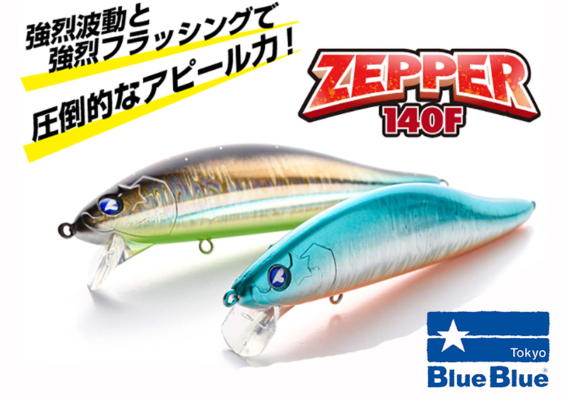 Το νέο δημιούργημα της BlueBlue ακούει στο όνομα Zepper 140F! Πρόκειται για ένα ιδιαίτερο τεχνητό δόλωμα, κάτι στο οποίο μας έχει συνηθίσει η BlueBlue. Κανένα από τα δημιουργήματά της δεν είναι τυχαίο. Όσον αφορά το Zepper 140F θα λέγαμε ότι είναι ένα minnow με ιδιαίτερη σιλουέτα αλλά και γλώσσα . Αυτός ο σχεδιασμός του σώματος του που ξεκινάει πιο χοντρό στο κεφάλι και καταλήγει σε πολύ λεπτό πίσω μέρος σε συνδύασμο με την πλατιά και κοντή γλώσσα, του δίνουν μία ιδιαίτερα νευρική κίνηση με έντονο rolling και wobling. Το Zepper 140F διαθέτει επίσης πρόσθετο βάρος εσωτερικά που παράγει όπως αναφέρει η Blueblue δύο διαφορετικές συχνότητες κατά την διάρκεια της ανάκτησης που εξιτάρουν ακόμα περισσότερο τα κυνηγετικά ένστικτα των θηρευτών. Μπορεί να κινηθεί με σταθερή ανάκτηση αλλά και με Jerks. Η απόσταση που καλύπτει κατά τη ρίψη του είναι πραγματικά εξαιρετική αναλογικά με το μέγεθος του που είναι 14 εκατοστά και το μεγάλο βάρος του που είναι 41 γραμμάρια ενώ παράλληλα είναι Floating τεχνητό και ίσως το βαρύτερο στην κατηγορία των 14 εκατοστών!! Η εξαιρετική βολή οφείλεται στο μεγάλο βάρος αλλά και στο άρτιο ζύγισμα του αλλά και στο νέο σύστημα με τις μαγνητικές μπίλιες, που είναι κατασκευασμένες από υλικό Tungsten, που έχει στο εσωτερικό του. Στοχεύει σε πληθώρα ψαριών όπως το λαβράκι, οι λούτσοι, οι λίτσες, τα γοφάρια κ.α.
