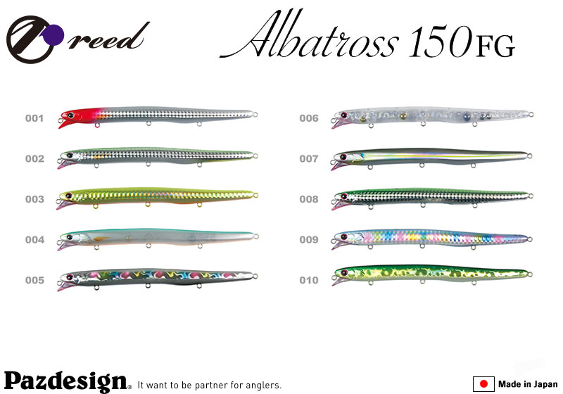 Το ALBATROSS 150FG έχει πολύ slim σιλουέτα και είναι ένα ιδιαίτερο καινοτόμο minnow που δεν συναντάμε εύκολα παρόμοιο σε άλλες εταιρείες. Λόγο της λεπτής σιλουέτας που διαθέτει έχει εξαιρετική βολή παρά το μεγάλο του μήκος κι αυτό οφείλεται στην ισορροπία που έχει καταφέρει να δώσει η PAZDESIGN τοποθετώντας κατάλληλα στο εσωτερικό του σώματος του τα βάρη.