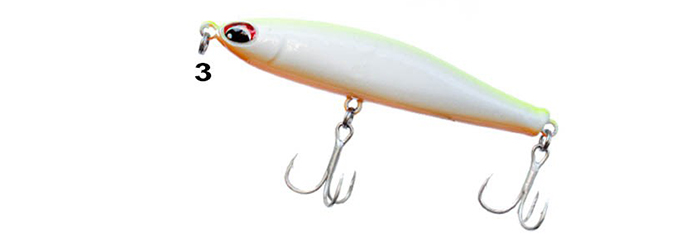 Τεχνητό της κατηγορίας Pencil ιδανικό για μακρινές βολές ακόμη και σε δύσκολες συνθήκες όπως ο κόντρα καιρός. Ανταποκρίνεται θαυμάσια στα απότομα τραβήγματα που πραγματοποιούμε με το καλάμι μας και η πλεύση του θυμίζει κίνηση βέλους ακριβώς κάτω από την επιφάνεια του νερού. Παρ’ όλο που βυθίζεται γρήγορα, μπορεί να ψαρευτεί και στα ρηχά με γρήγορη ανάκτηση και ψηλά το καλάμι. Διατίθεται σε διάφανα χρώματα ή βαμμένα σχέδια, με πολλές αντανακλάσεις στα πλευρά.